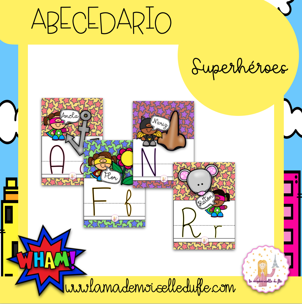 Este PDF incluye carteles visuales del abecedario para trabajar o decorar la clase con la temática de los superhéroes.