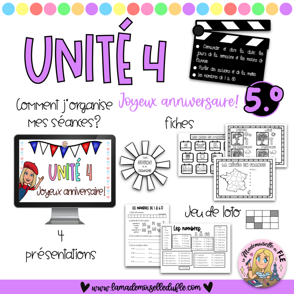 Este material se compone de 4 presentaciones y 8 fichas de trabajo para trabajar los días de la semana, meses del año, estaciones, el tiempo metereológico y los números de 1 a 60 en clase de francés.