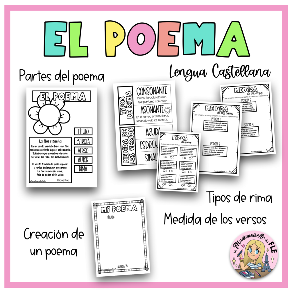 Este material inlcuye un PDF para trabajar en clase de Lengua Castellana, el poema: partes del poema, tipos de rimas y métrica de los versos.
