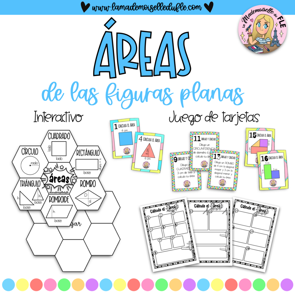 ¡Hola! Encontrarás un PDF para crear un interactivo para colorear y completar con las fórmulas de las áreas de las figuras planas y un juego de tarjetas para repasar este contenido con tus peques.