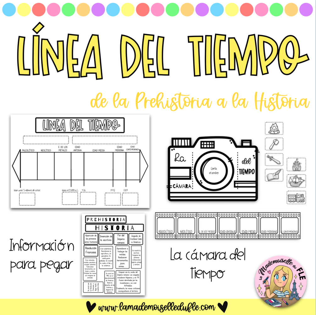 Este PDF incluye la línea del tiempo con toda la información y la cámara del tiempo para trabajar en Sociales las diferentes etapas de la Prehistoria y de la Historia.