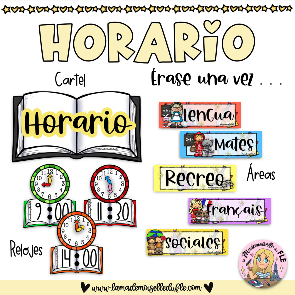 Este PDF incluye las etiquetas de las áreas escolares y los relojes con diferentes horas y otros en blanco, siguiendo la temática del Érase una vez.