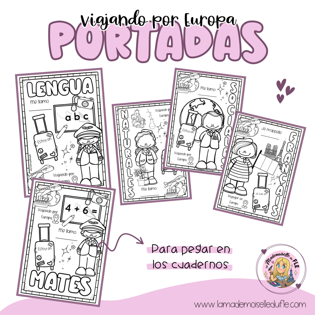 Incluye dos PDF con 18 portadas cada una siguiente la temática de Viajando por Europa y Viajando por el mundo. Las portadas que hay son de LENGUA, MATES, NATURALES, SCIENCES, SOCIALES, CONOCIMIENTO DEL MEDIO, FRANÇAIS, ENGLISH, RELIGIÓN, VALORES, AT. EDUCATIVA, MÚSICA, MUSIC, PLÁSTICA, DIBUJO Y ART.