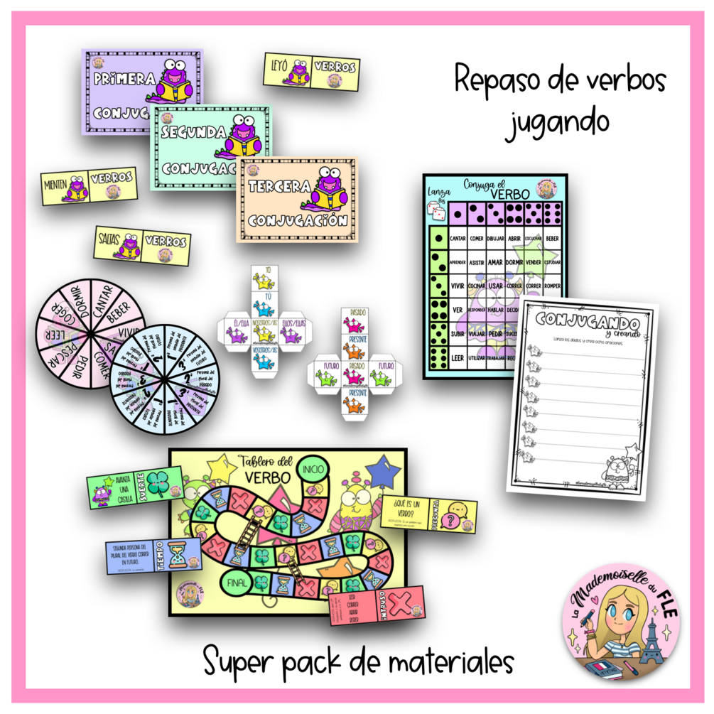 Este PDF incluye diferentes fichas interactivas para trabajar de forma visual e interactiva el verbo: sus tres conjugaciones, la persona y el número y el tiempo verbal. Además, incluye diferentes juegos para poner todo esto en práctica.